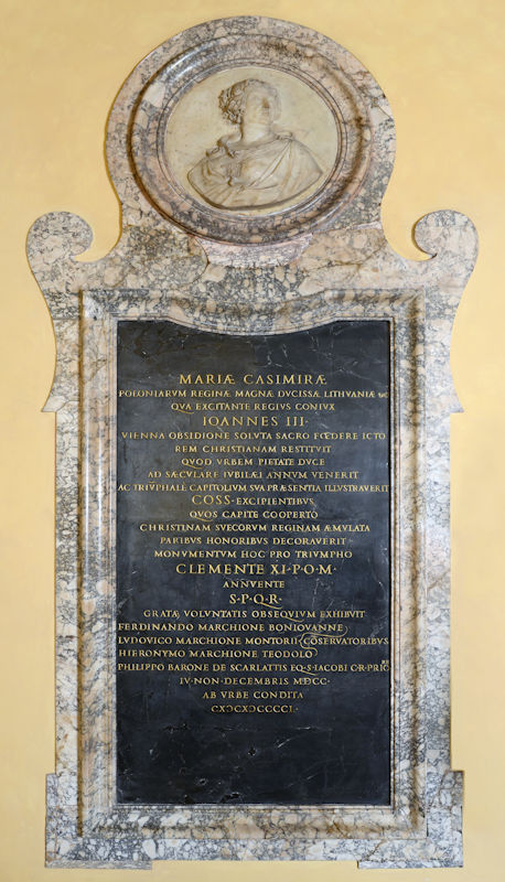 Maria Casimira de la Grange d’Arquien (1641-1716), francese di nascita, fu moglie di re Giovanni (Jan) III Sobieski di Polonia, che il 12 settembre 1683 fermò a Vienna l’avanzata ottomana. Alla morte del marito la vedova preferì recarsi a Roma, anche per sfuggire alle pericolose battaglie di successione al trono. La presenza della famiglia reale polacca, ricevuta con tutti gli onori dal Papa e dalla nobiltà, sollevò sempre un grande interesse misto a curiosità per le vicende che la videro protagonista. Inoltre, profonda fu l'influenza esercitata sulla vita culturale romana dalla regina, annoverata nell’Accademia dell’Arcadia e patrona di importanti eventi musicali e lirici nella sua corte a Palazzetto Zuccari, in piazza Trinità dei Monti.