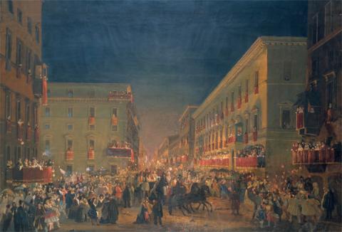 I luoghi simbolo della città pontificia appaiono relegati in secondo piano, per lasciare spazio alle nuove festività laiche.