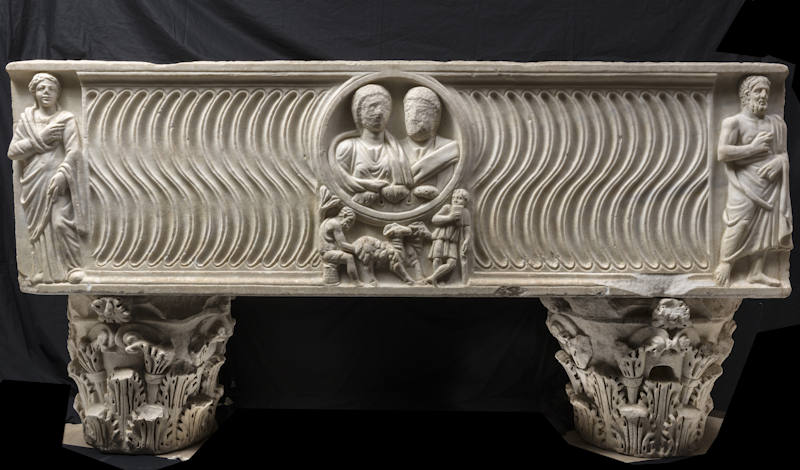 Ingresso Pinacoteca: Sarcofago strigilato con i busti dei coniugi