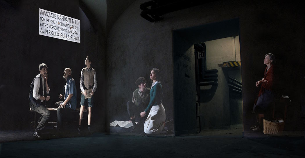 Une série de projections décrit la double perspective de ceux qui bombardent et qui, d'en haut, n'en perçoivent pas les effets, et de ceux qui, d'en bas, en subissent les conséquences. Au sol, des images de Rome vue des avions en vol lors d'un bombardement circulent, tandis que sur les murs est projetée la ville en ruines.
